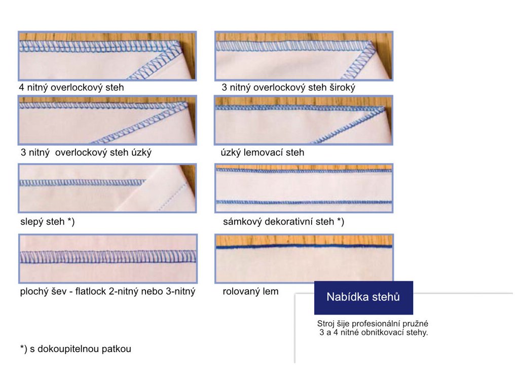 - Šije jako třínitný nebo čtyřnitný, nabízí 8 druhů stehů