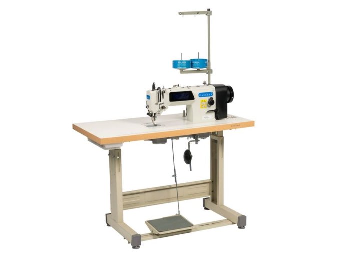 Jednojehlový plochý šicí stroj se spodním ponorným a patkovým podáváním, zabudovaným servomotorem a LED osvětlením. Zdvih patky, odstřih nití a zpátkování urychlují výrobu a snižují spotřebu nití.