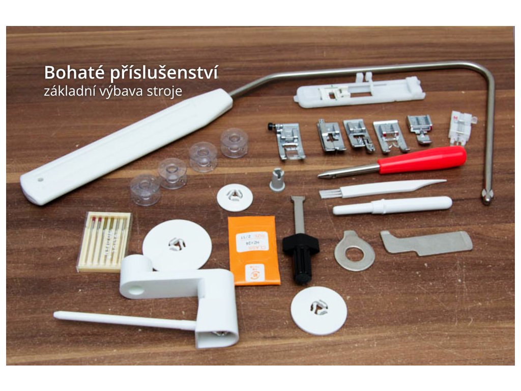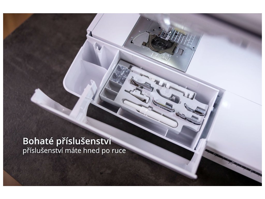 Samozřejmostí je volné rameno pro šití nohavic a rukávů, robustní celokovové tělo stroje, ergonomicky umístěná tlačítka, možnost ponoření podavače pod stehovou desku při látání a quiltování, LED osvětlení, rychlá výměna patek pouhým nacvaknutím. Brother používá moderní tiché rotační chapače, které se jednoduše čistí, nit nasadíte během okamžiku a během šití průhlednou krytkou vidíte, kolik nitě vám zůstává na cívce. V přihrádce na příslušenství najdete praktický pořadač na patky, takže máte vše připraveno.