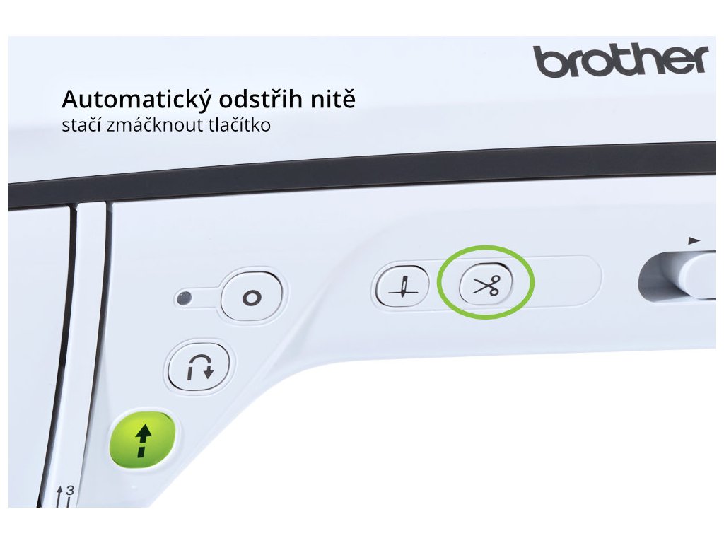 Možnost šití bez pedálu - s nastavitelným posuvníkem regulace rychlosti, stačí zmáčknout tlačítko Start/stop a šít. Tato funkce vám také zjednoduší navíjení spodních cívek a šití knoflíkových dírek. Už nebudete muset šlapat na pedál. Šití urychluje také funkce automatický odstřih nitě - kdy po automatickém zapošití stroj sám provlékne obě nitě do rubu a tam je odstřihne asi na 2 cm.