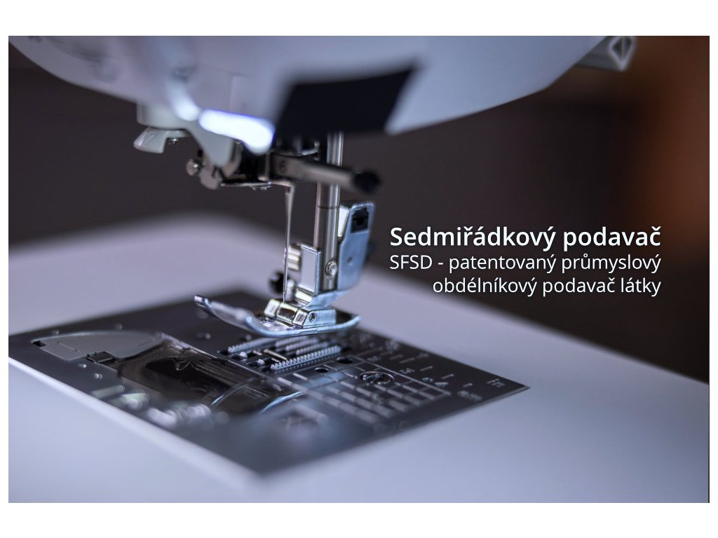 S vysokými a silnými látkami si hravě poradí - má silný vpich jehly, velký pracovní prostor, regulací přítlaku patky, je vybaven patentovaným obdélníkovým podavačem SFDS (Square Feed Drive System) i šicí patkou s fixací polohy.