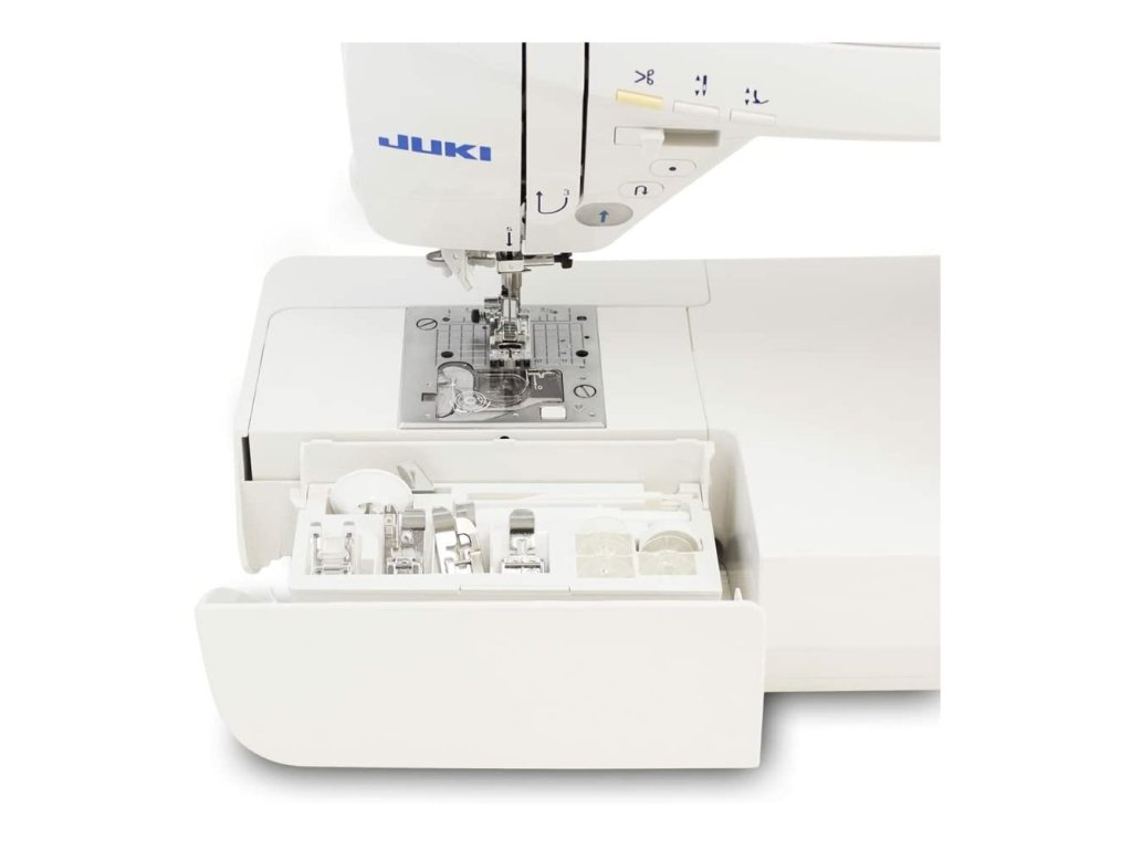 Pro zvýšení všestrannosti nabízí Juki výběr funkcí ovládaných spouštěčem, který je již v základní výbavě stroje. Patní části ovládacího spouštěče můžete nyní přiřadit funkce: Zdvižení přítlačné patky · Odstřih nitě · Zapošití zpětnými stehy · Zapošití stehy na místě · Pozice jehly nahoru/dolů · Ušití jednoho stehu · Žádná funkce – deaktivace.